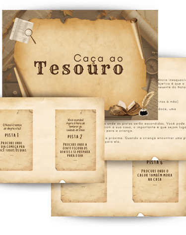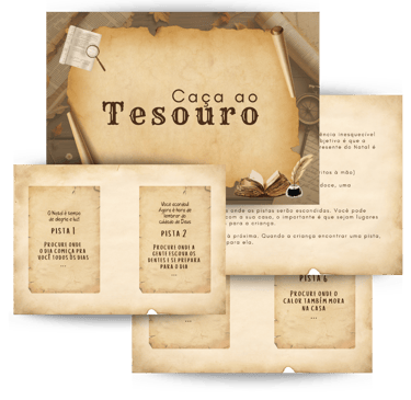 Um material de aventura e diversão para o Dia de Natal , que ensina a criança a seguir pistas até encontrar o presente e entender que Jesus é o verdadeiro tesouro!